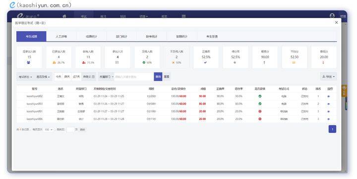 五、答题数据分析:有强大的数据统计分析功能,可从多维度进行数据分析;将成绩、正确率、得分率以及每道试题的答题次数、答对/错次数、错误率等考试数据进行分析整理,生成考生成绩、成绩统计、缺考统计、答题统计等报表。