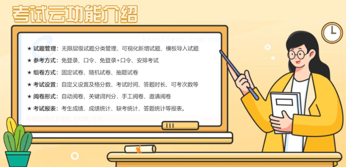 考试云线上学习平台能够提供在线考试、电子作业、自测练习、模拟考试、智能组卷、试卷分享、试题库搭建、试卷批阅等功能,为教育机构、企业单位的考务工作带来了很多的便捷之处。