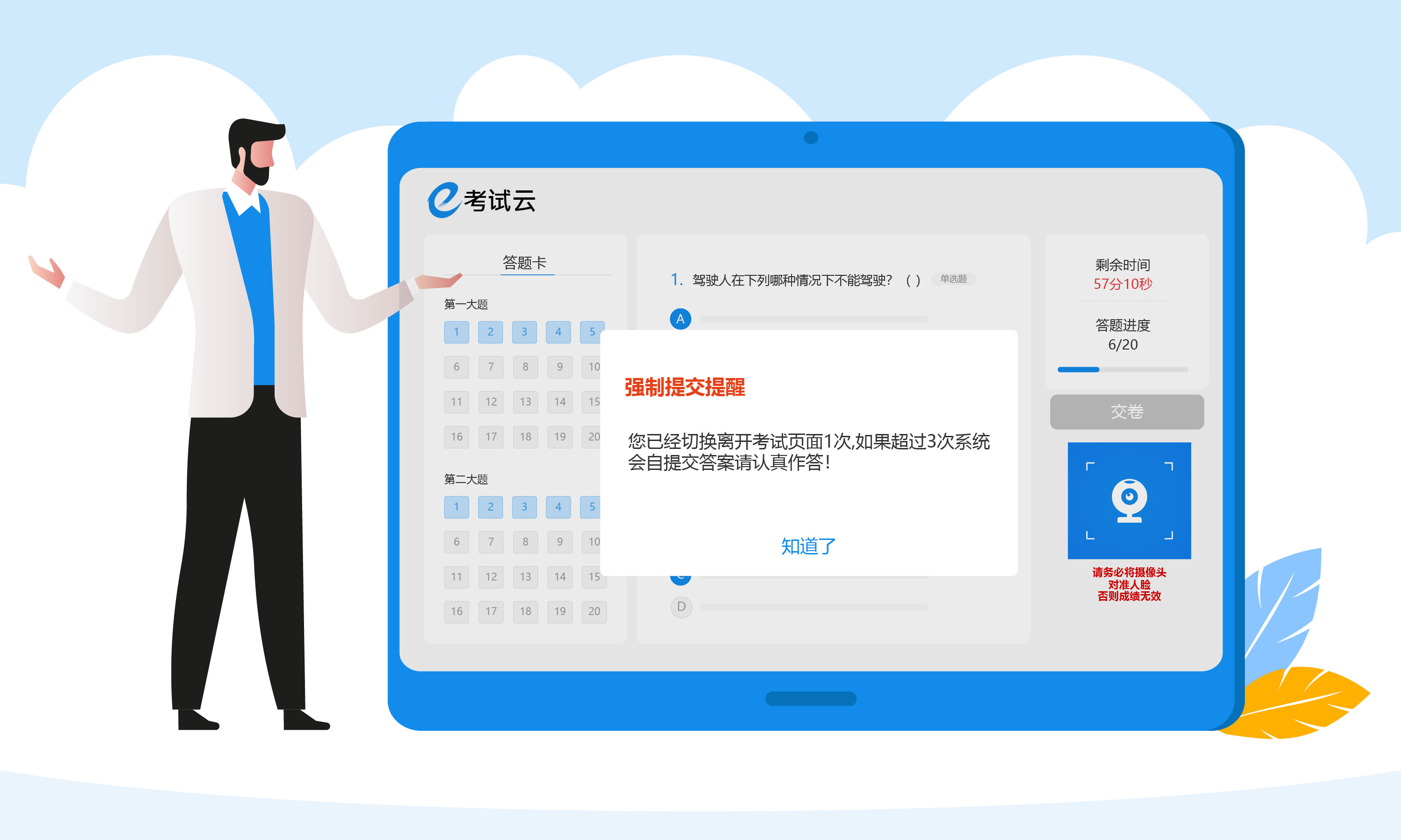 考试云线上考试平台有多样化的防作弊机制,能够结合人脸识别、摄像头定时抓拍实时监测考试过程;有考试防切屏、无操作强制交卷、试题乱序、选项乱序等协助监管考试过程,降低考试作弊的机率。