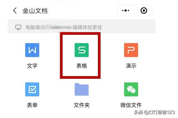 第四步 选择文件的类型,可选择:文字、表格、演示、表单、文件夹等。在这里,选择【表格】。
