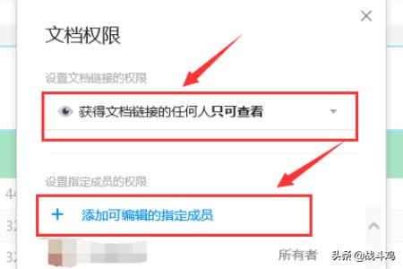 4、在文档权限的对话框中,点击设置文档链接权限的对话框选择相应的权限,也可以设置指定成员的权限,设定完后点击确定。