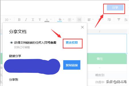 4、在文档权限的对话框中,点击设置文档链接权限的对话框选择相应的权限,也可以设置指定成员的权限,设定完后点击确定。