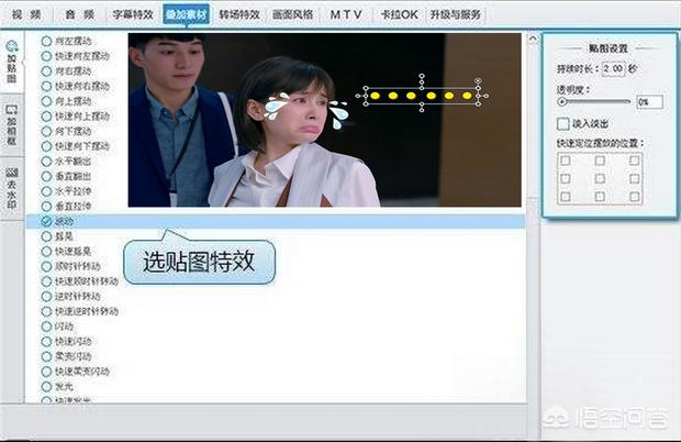 第八步:在“叠加素材”面板的“加贴图”栏目中,可以给视频添加各种各样的恶搞贴图,让视频更加欢乐逗趣(如下图):