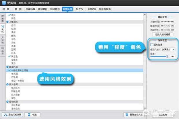 第七步:在“画面风格”面板中,用“美化”栏目下的“磨皮”和“美白”功能,让视频中的人物看起来高颜值。除此之外,还有电影胶片、一键电影专业调色等功能,还能搭配使用,结合程度拉杆调出更多更有范儿的视频色调(如下图):