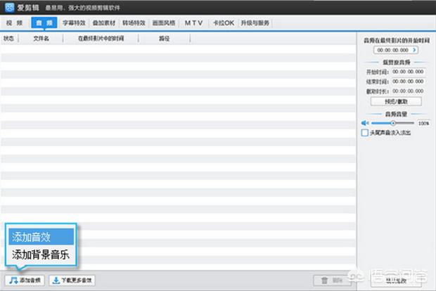 第四步:在制作视频短片的时候,适当配上一首背景音乐或其他音效,可以让视频效果更赞。切换到“音频”面板,点击“添加音频”,就可以快速添加背景音乐或音效了(如下图):