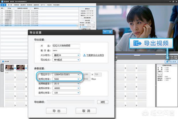 第九步:剪辑完成之后,点击“导出视频”,在“导出设置”对话框中可选择导出720P或以上分辨率,并把比特率调到3500Kbps以上,静候片刻,一部视频短片就制作完毕了。这个时候你就可以将自己制作的视频短片上传到各个视频网站和社交平台,就有可能变成网红哦(如下图):